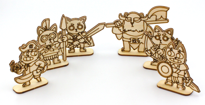 Arkusz sklejki z figurkami kotów: wiking, pirat, łucznik, paladyn, wojownik, łotrzyk.